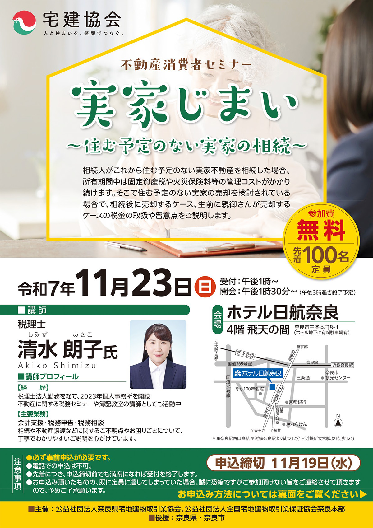 (公社)奈良県宅地建物取引業協会・(公社)全国宅地建物取引業保証協会奈良本部共催による、不動産消費者セミナーを下記により開催いたします。